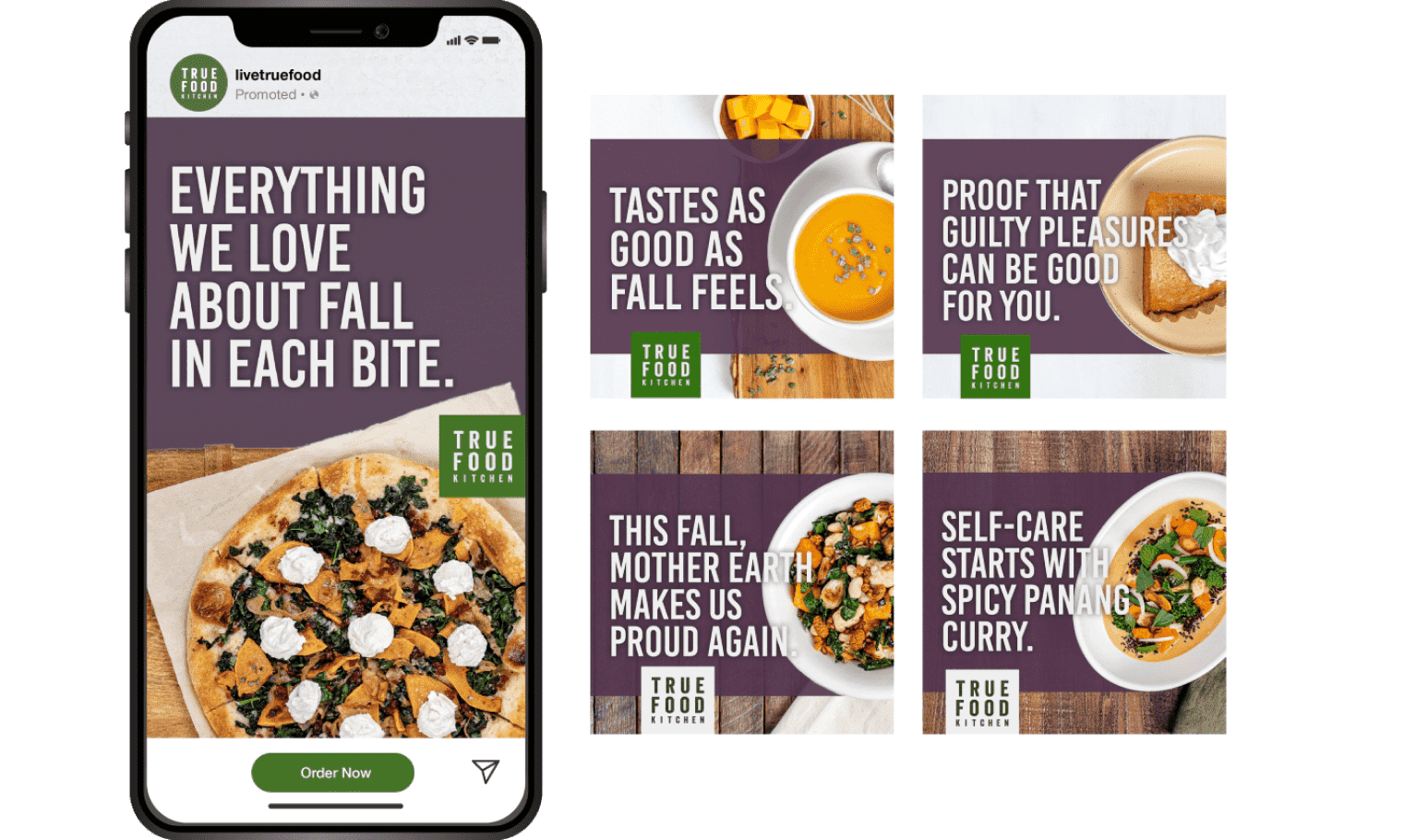 Our creative team brainstormed new ways to freshen up True Food Kitchen’s fall imagery and messaging. Our goal was to reinforce their optimistic messaging with exciting imagery showcasing their fresh and crave-able menu. Their fall menu included a bounty of superfoods that help bolster health and spirit. Our campaign framed True Food Kitchen as a place where the community could not only eat better – but feel better.